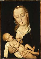 The Virgin and Child from the workshop of Dirck Bouts. the first image is the original painting. The second image is a closeup black and white photograph of the virgin