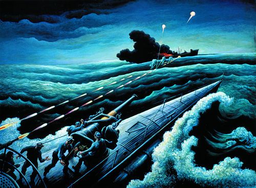 In 1913 Benton returned to New York City until being called to serve in the US Navy during World War I. Benton was stationed in Norfolk, Virginia as a wartime artist. Benton’s task was to draw camouflaged ships, making sure that the camouflage patterns were adequately applied.