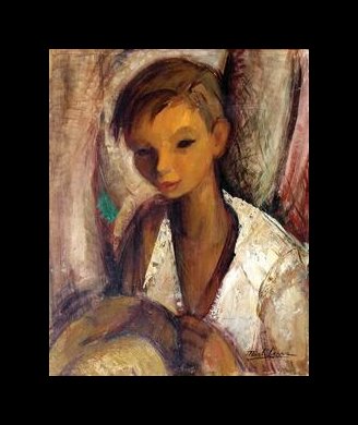 A student under Leopold Romanach at the San Alejandro School, Cerra painted in earthy tones. Her earliest work is of her childhood memories on the farm, and she painted many “guajirito’s” (earth men, as the local farmers were called). These paintings are soft, yet eerie. Her trademark for painting these farmers was to depict them with vacant, dark almond shaped eyes, like in “Guajirito” (1949).
