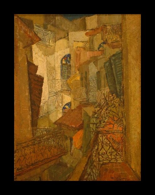 One could compare her cityscapes to the style of Gustav Klimt-warm tones, intense blue and rose colors and an almost mosaic-like approach to Cubism. While Cerra embraced some of the Cubist ideas, she would usually only incorporate them through buildings and windows in her city scenes, as apposed people or plants.