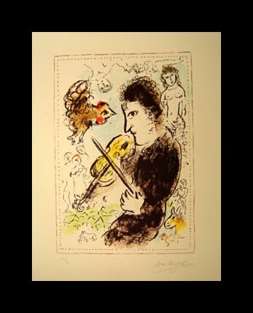 Chagall's paintings are much softer and never harsh like many of Picasso's. There is an underlying lyrical quality to the lithographs.