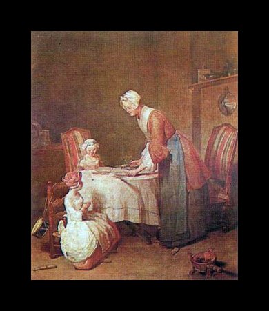 Perhaps the reason that Chardin’s work has stood the test of time is that his themes are very universal. He painted the bourgeois in the same light as the peasantry, and portrayed them doing normal activities and not just lounging or posing.