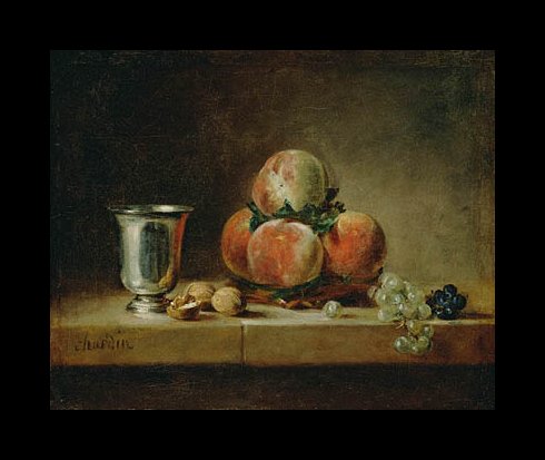 As can be seen in his painting “Still Life with Peaches,” Chardin would often incorporate his name into his composition as simply “chardin.”