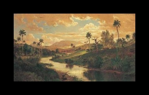 It was not until around the 1880’s that landscape painting became popular in Cuban, and Chartrand was at the forefront of this movement. Unlike his fellow French-style landscape painter, Guillermo Collazo, Chartrand painted scenes that were definitely of Cuba. Though highly stylized in the European way, his landscapes were clearly that of Cuban tropicalia, including all of the exotic floral of the island. A typical scene of Chartrands can be seen in his painting “Paisaje” (circa 1870s).