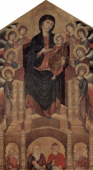 Among Cimabue’s few surviving works are the Madonna of Santa Trinita, once in the church of Santa Trinita, and now housed, with Duccio’s Rucellai Madonna and Giotto’s Ognissanti Madonna, in the Uffizi Gallery.
