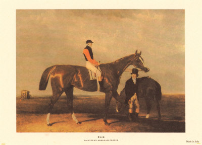 Abraham Cooper was an English animal and battle painter. He was born in London and was the son of a tobacconist. At the age of thirteen he became an employee at Astley’s Amphitheatre, and was afterwards groomed in the service of Sir Henry Meux. When he was twenty-two, wishing to possess a portrait of a favorite horse under his care, he bought a manual of painting, learned something of the use of oil-colours, and painted the picture on a canvas hung against the stable wall. His master bought it and encouraged him to continue in his efforts. He accordingly began to copy prints of horses, and was introduced to Benjamin Marshall, the animal painter, who took him into his studio, and seems to have introduced him to the Sporting Magazine, an illustrated periodical to which he was himself a contributor.