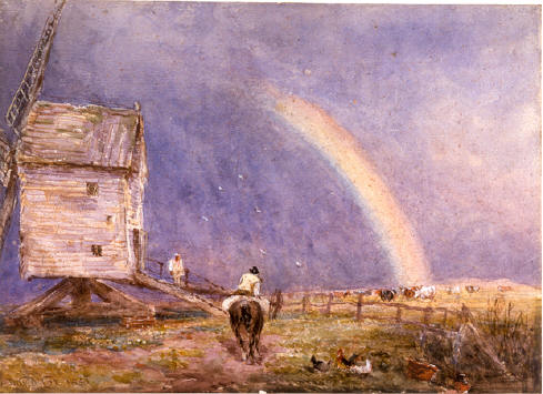 In around 1798, he was apprenticed to a maker of fancy articles named Fieldler, and soon learnt to paint portrait miniatures. Following Fieldlers suicide, he was next employed as an assistant to scene-painter De Maria in the theater. In 1804, he took up work as a scene painter at Astleys Theatre and moved to London. While living in London, Cox married his landlord’s daughter, Mary Agg, and the couple moved to Dulwich in 1808. In the same year, he abandoned scene-painting, and took up watercolor painting for which he became famous.