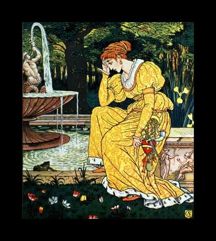In 1871, Crane was married and took an extended trip to Italy. By 1874, Crane had established himself as a well known book illustrator and was allowed more creative freedom. His 1874 illustrations for “The Frog Prince” showed a strong Japanese-style influence.