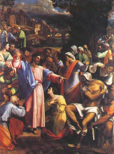 According to Vasari, Michelangelo befriended Sebastiano and offered pictorial designs for him to develop in paint. Four pictures for which this is claimed are the Pietà in the church of the Conventuali, Viterbo; the Transfiguration and the Flagellation in the Borgherini Chapel of the church of San Pietro in Montorio, Rome; and, most celebrated of all, the Raising of Lazarus, now in the National Gallery, London. This grand work – more remarkable for general strength of pictorial perception than for qualities of detailed intellectual or emotional expression – is more than 3,5 by 2,5 meters in dimensions, with the principal figures of the natural size transferred from wood to canvas in 1771. It was painted in 1517-1519 for Giulio de Medici, for the bishop of Narbonne, afterwards Pope Clement VII; and it remained in Narbonne cathedral until purchased by the duke of Orleans early in the eighteenth century, coming to England with the Orleans gallery in 1792. It has been generally admitted that the design of Michelangelo appears in the figure of Lazarus and of those who are busied about him (the British Museum contains two sketches of the Lazarus regarded as Michelangelo’s handwork); but whether he actually touched the panel, as has often been said, appears more than doubtful, as he left Rome about the time when the picture was commenced. Raphael’s Transfiguration was painted for the same patron and the same destination. The two works were exhibited together, and some admirers did not scruple to give the preference to Sebastiano.