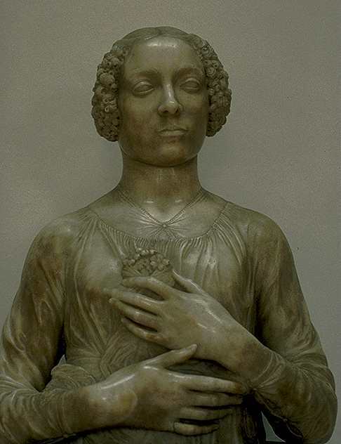 After the mid-1470s Verrocchio was devoted mainly to sculpture, at first following the standard Florentine canons. These are well in evidence in the bronze statue of David (c. 1476, now at Bargello), commissioned by Lorenzo and Giuliano de’ Medici. Verrocchio’s David is underage, modestly clad in contrast to Donatello’s provocative David, and haughty in his conquest. The Gothic-like, idealistic beauty of the features is closer in spirit to Ghiberti than to the innovative Donatello. Around 1478 he finished a Winged Cherubim with Dolphin, today housed in Palazzo Vecchio and originally intended for a fountain in the Medici villa of Careggi: this work is influenced by dynamic naturalism which Verrocchio learned from Desiderio da Settignano. Of the same period are the Dama col mazzolino and the relief for the funerary monument of Francesca Tornabuoni for Santa Maria sopra Minerva in Rome (now in the Bargello).