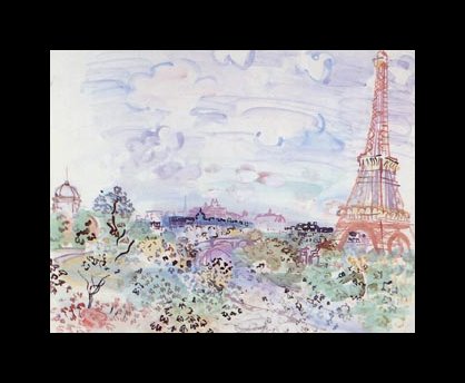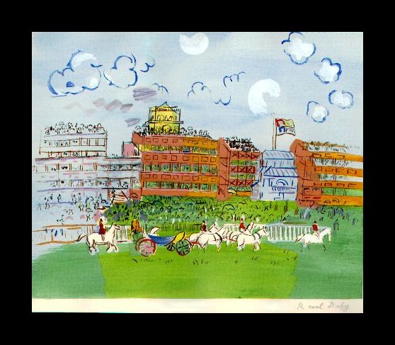 While in Paris, Dufy became friends with fellow painter Georges Braque. During this time, he was heavily influenced by the Impressionistic landscape painters of the day. Dufy went through a number of phases in the beginning of his artistic career, from Impressionism to Fauvism to Cubism. Dufy’s work mirrored all of these styles, but he essentially did not fit into the mold of any one of these movements. He finally developed his own style of colorful and highly structured compositions painted in swift brush strokes of typical open-air Parisian scenes and landscapes. This style became known as Stenographic.
