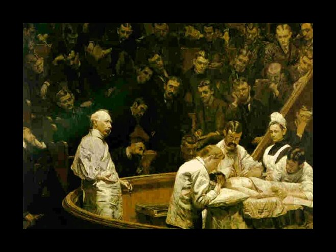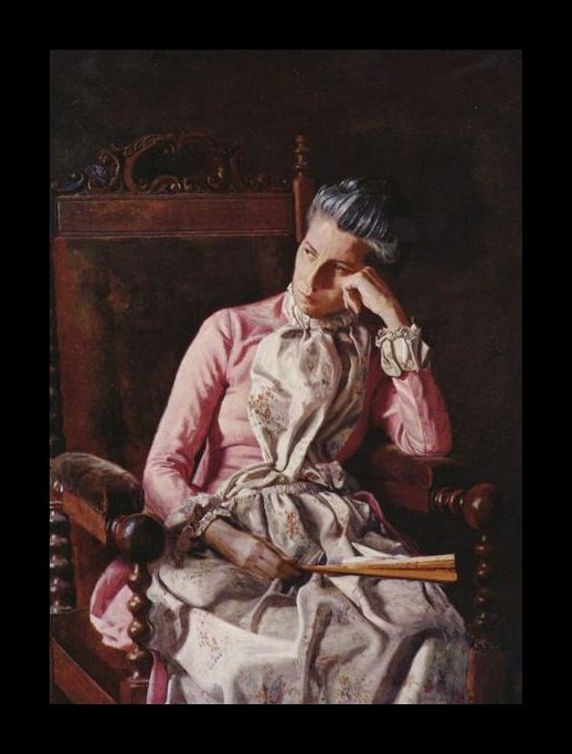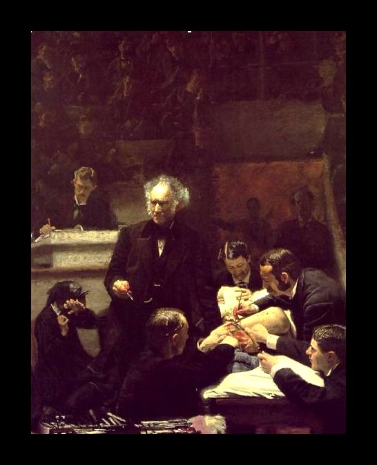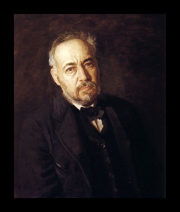 Thomas Eakins was an American painter born in Philadelphia, and has been called one of America’s greatest painters of all time. He painted in the Realist style, and began his studies at the Pennsylvania Academy of Fine Arts. From 1866-1870 he lived and studied in Europe, studying under Jean-Leon Gerome in Paris. During his time in Europe, he also traveled to Spain quite often, and was highly influenced by Diego Velazquez. This Spanish influence can be seen in many of his paintings, particularly in his own self-portrait, as well as his other portraits and genre scenes such as two of his best known paintings, “The Gross Clinic” and “The Agnew Clinic.”