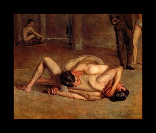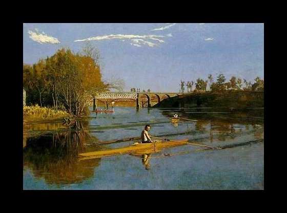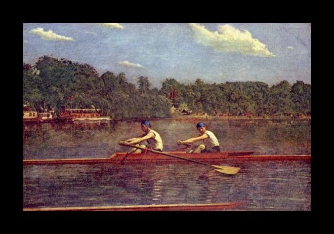Eakins early paintings were created by using motion studies captured on film. As a result, he painted many scenes of rowers, wrestlers or boxers, capturing them in motion. He also became known as a photographer, though he did not exhibit his photographs.