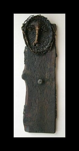 Though the majority of her work is done in oil on canvas, she also did a great deal of work in mixed media to create a dark and gritty look. Motherhood and even patriotism were some of her themes. Sometimes ironic, other times full of compassion, Eiriz was able to fully express the darker side of human emotion in her compositions. One of the best examples of her later work in mixed media is “Apariciones” (1995).
