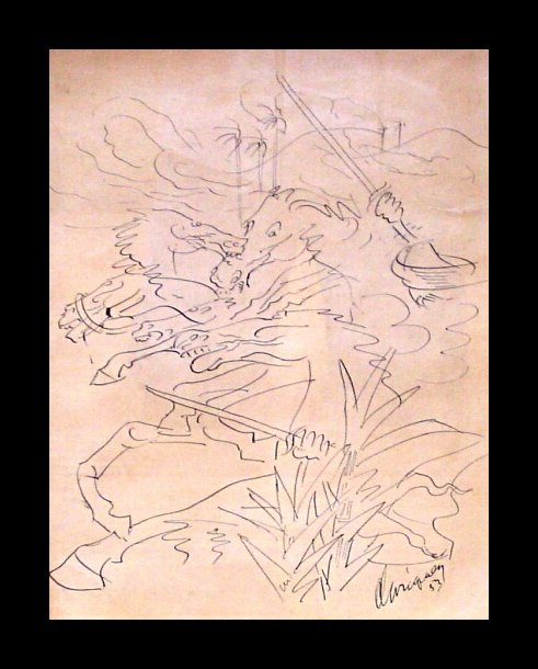 Though usually painting in a whimsical style, Enriquez was not blind to the political turmoil happening in his country. He also used his artistic talent to express his political and social ideas through his depictions of the Cuban peasantry and guerilla fighters. Expressionist-style paintings and sketches such as “Caballos en Combate” (1953) are perfect examples of his politically fueled pieces.