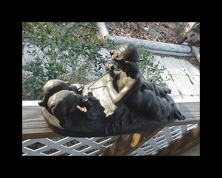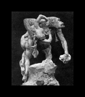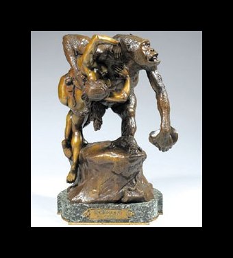 Next to animals and sculptures of historical figures he also produced a series of small military statuettes as a commission from Emperor Napoleon III and a group of most interesting primeval representations, such as his Stone Age Man, Orangutans and Borneo Savage, the Gladiator and Gorilla, Gorilla Dragging a Soldier by the Hair and perhaps most famous of all, his Gorilla Abducting a Woman, which earned him a medal at the Paris Salon of 1877.