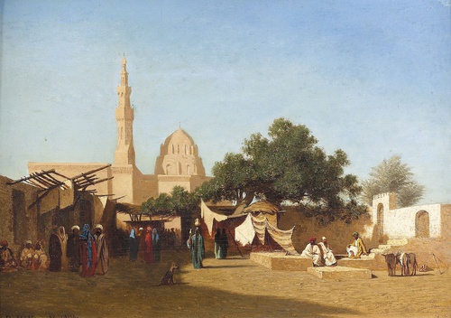 Frere visited Algeria in the 1830’s, becoming infatuated with the Oriental other, as did many of his contemporaries. He rapidly departed from the genre Realism in which he had been trained (influenced by Gerome) and later traveled widely in the Arab world. There was a ready market for his stock images in Europe; caravans arriving, resting and leaving, market and mosque scenes, and of course the Nile. He was uninterested in the monumental past, preferring atmospheric scenes of daily street life. He also eschewed the subject of the harem, unlike many bolder artists. During this first trip to Algeria he produced several large paintings for the King of Wurttemberg. In 1841, he sent two paintings to the Salon, which were later purchased by Louis Philippe.