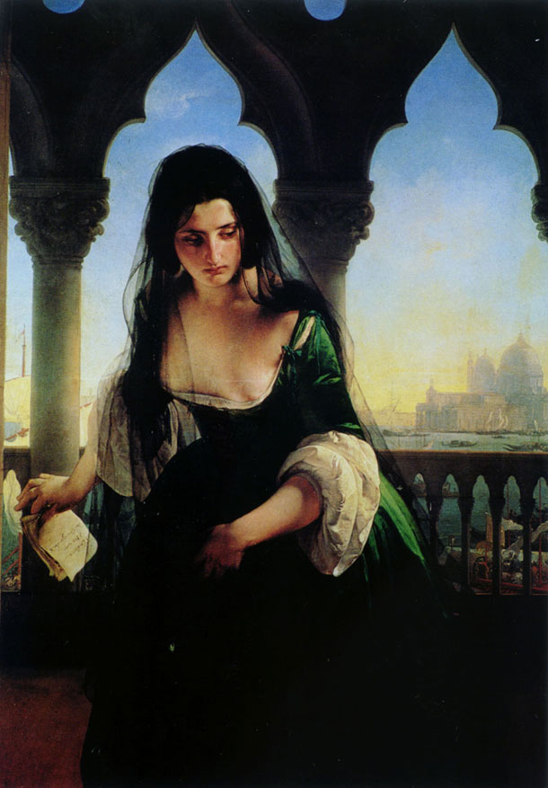 Art historians and researchers have discovered that Hayez generally did not date or sign his works. The only evidence that researchers have of the age of his paintings are generally based on when they were initially sold by the artist, and not by when the artist created them. So the age of most of Hayez’s paintings are not approximate. In addition, Hayez was known to create the same composition several times, making almost exact duplicates of the same paintings. Therefore, one may have an original painting by Hayez and not know it, thinking that it is a copy!
