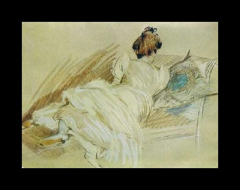 Helleu’s favorite model by far was his wife, Alice Guerin, and later Madame Helleu, whom he met when and began sketching when she was only 14. Later, their eldest daughter Ellen would also become a favorite model of his. Both Helleu and his wife became high society figures, and their graceful and elegant lifestyle was echoed in his compositions.