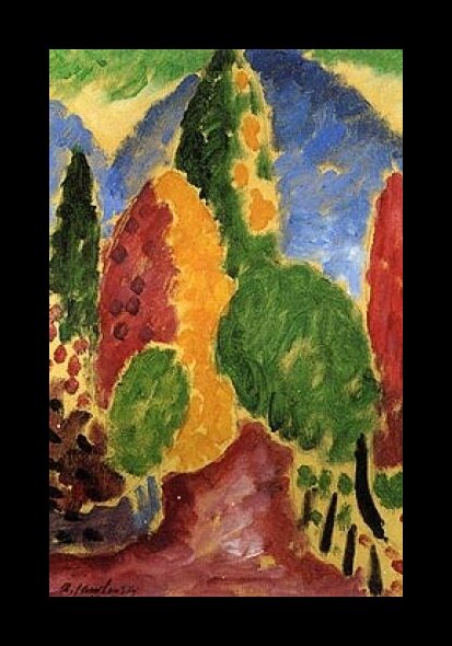 It is known that Jawlensky spent most of his life in Germany, where he eventually died. His painting reflects the German landscape, as can be seen in Landscape Variation and Hills(1912). Unlike many other Fauvist or Impressionist painters of the time, who painted their landscapes of the sea or the French countryside, there is something more obviously northern about the landscapes that Jawlensky paints. More hills and pine trees dominated his landscapes, a sure sign of a German landscape.