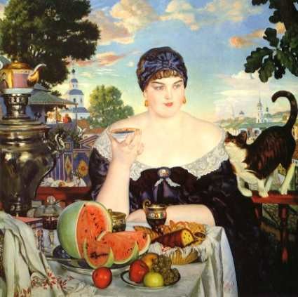 In 1909, he was elected into Imperial Academy of Arts. He continued to work intensively, but a grave illness—tuberculosis of the spine—required urgent attention. On the advice of his doctors he went to Switzerland, where he spent a year undergoing treatment in a private clinic. He pined for his distant homeland, and Russian themes continued to provide the basic material for the works he painted during that year. In 1918, he painted The Merchant’s Wife, which became the most famous of his paintings.