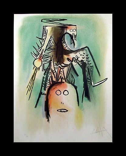 This style is typical of his lithographs, which usually contain a preying mantis/organic subject, and are reminiscent of Cuban and Voodoo cultural elements. These lithographs were mostly created in the early 70′s and are unique in the fact that they were all printed into signed and numbered into limited editions of 99, not an even 100. Furthermore, due to the fact that he lived primarily in Paris, his art titles are in French, and not Spanish.