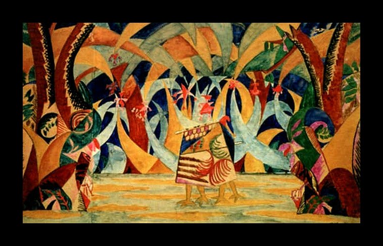 In 1914, Larionov was injured while conscripted in the army. Art historians believe that because he was badly wounded, Larionov could no longer concentrate on art in the same way that he used to. As a result, he suffered a lack of creativity as well, and began to produce less and less work. Nonetheless, Larionov left Russia for Paris in 1915 to work with ballet owner Sergei Diaghilev on productions of the Ballets Russes. He designed sets for “Soleil de Nuit” in 1915 and “Kikmore” in 1916. He traveled with the Ballets Russes from 1915-1918, visiting Spain, Rome and Switzerland.