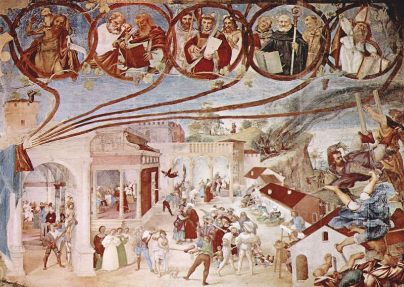 His next paintings are mostly wall paintings. In 1524 he painted a series of frescoes with the lives of saints (such as St. Clare) in the Suardi chapel in Trescore (near Bergamo). In the details he depicts scenes of every life, such as in the fresco Martyrdom of St. Claire.