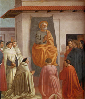 In 1424 the “duo preciso e noto” (“well and known duo”) of Masaccio and Masolino was commissioned by the powerful and rich Felice Brancacci to execute a cycle of frescoes for the Brancacci Chapel in the church of Santa Maria del Carmine in Florence. The theme of the frescoes in the little chapel was to be the “Histories of St. Peter”. The genius of Masaccio shows clearly in these frescoes. In the “Resurrection of the Son of Theophilus”, he painted a pavement in perspective, framed by large buildings to obtain a depth of field and three-dimensional space in which the figures are placed proportionate to their surroundings. In this he was a pioneer in applying the newly discovered rules of perspective.