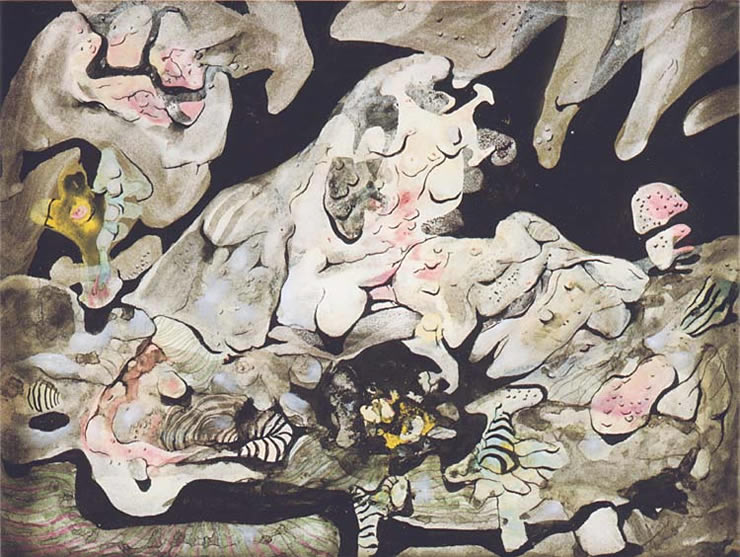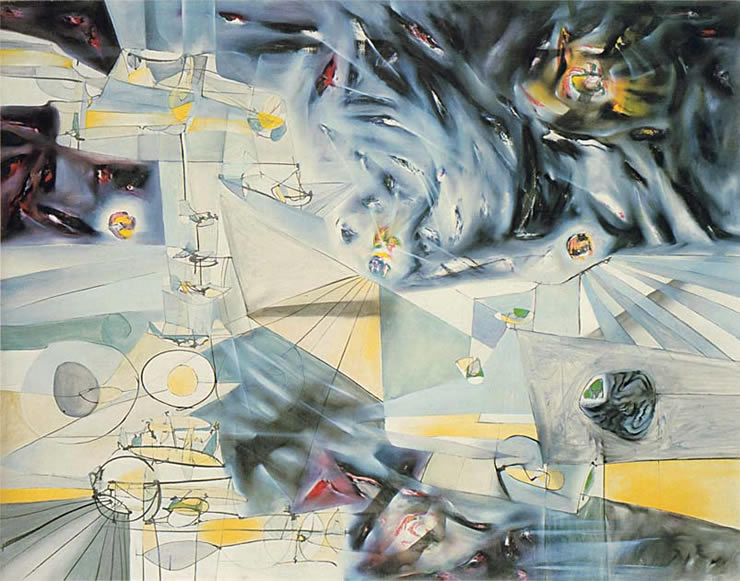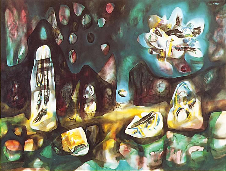 Though Matta was essentially expelled from the Surrealists in 1947 after a fight with Breton, he was truly one of the most experimental artists in the group. He would combine natural, organic elements with otherworldly life forms, machinery and strange creatures all in a cosmic landscape. Most of all, Matta experimented with Abstract forms within his Surrealist compositions. Despite the fact that he was no longer officially belonged to the Surrealist group, he continued to paint in that style his entire career. Art critics have said that Matta’s work can be divided into two different sections; apocalyptic painting and cosmic painting. Matta also stands out from any of the other Surrealists because his themes are political and social in nature, while most other Surrealists dealt with dreams and the psyche.