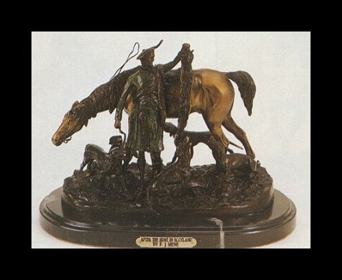 Mene’s first exhibit was in 1838 of a Dog and Fox cast in bronze. He exhibited annually at the Salons. Throughout his lifetime, he exhibited a couple of models each year. He received numerous awards for his work. His subjects of choice were horses and dogs.