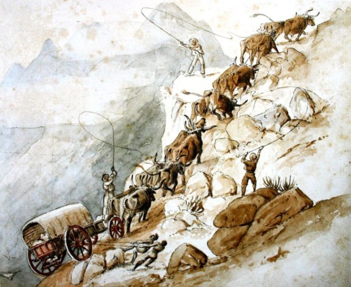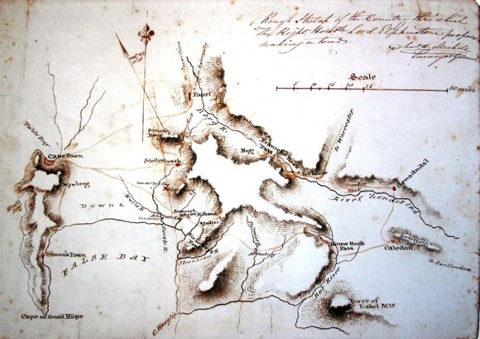 He acted as assistant quartermaster in the Sixth Frontier War in 1834. His most active area was in the planning and construction of roads, as well as their improvement, being responsible for the planning of Michell’s Pass near Ceres – a vast improvement on the old Mostert’s Hoek Pass – and the Houw Hoek Pass near Elgin, both carried out by Andrew Geddes Bain, as well as the Sir Lowry’s and Montagu Passes, the latter constructed over the Outeniqua Mountains by an Australian road-engineer Henry Fancourt White in 1843-47. Besides all his other skills, Michell was an accomplished water-colorist, particularly of landscapes. His illustrations appeared in Narrative of a voyage of observation among the colonies of Western Africa and of a campaign in Kaffirland (1837), written by his son-in-law, Capt. Sir James Edward Alexander. He was granted a pension in 1848 and returned to England where he died on 28 March 1851 at Eltham.
