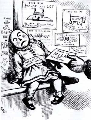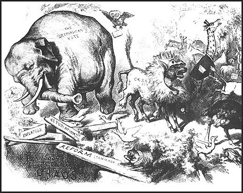 In 1873, 1885, and 1887, Nast toured the United States as lecturer and sketch artist, but with the advent of new methods and younger blood, his vogue decreased. After the death of Fletcher Harper, he focused on oil paintings and book illustrations. He shared political views with his friend Mark Twain and was for many years a staunch Republican. Nast strongly opposed President Andrew Johnson and his Reconstruction policy, ridiculed Horace Greeley’s candidacy, and opposed inflation of the currency notably with his famous rag-baby cartoons. His advocacy of civil service reform and his distrust of James G. Blaine forced him to become a Mugwump, but in 1892, he returned to the Republicans in support of Benjamin Harrison.