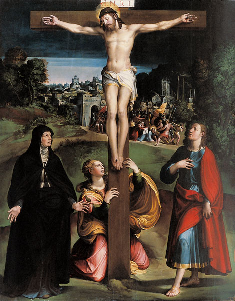 His style was modified by exposure to notably Correggio and Parmigianino when he moved to Bologna in 1547. In Bologna, most of his painting depicted elaborate landscapes and aristocratic genre scenes of hunting and courtly loves often paralleled in mythological narratives. It was during this time that he decorated the Palazzo Poggi and executed a cycle of frescoes illustrating Orlando Furioso in the ducal palace at Sassuolo near Modena.