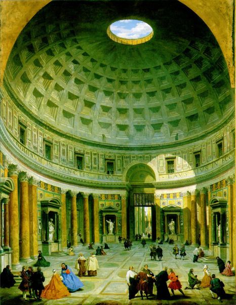 As a young man, Pannini trained in his native town of Piacenza as a stage designer. In 1711, he moved to Rome, where he studied drawing with Benedetto Luti and became famous as a decorator of palaces, including the Villa Patrizi (1718-1725) and the Palazzo de Carolis (1720). As a painter, Pannini is best known for his vistas of Rome, in which he took a particular interest in the city’s antiquities. Among his most famous works are the interior of the Pantheon, and his vedute — paintings of picture galleries containing views of Rome. Most of his works, specially those of ruins have a substantial fanciful and unreal embellishment characteristic of capriccio themes.