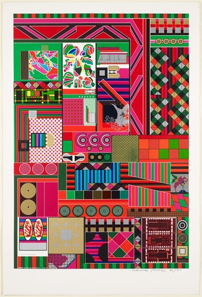 By the 1950s, Paolozzi moved back to London and set up his studio, filled with materials and collected objects. Paolozzi worked with a variety of media, but it was his silkscreen prints that led to his initial fame. His prints took on a colorful, collage-like aesthetic, containing a variety of pop imagery.