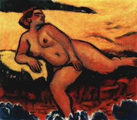 Max Pechstein was a German expressionist painter and printmaker, born in Zwickau. Early contact with the art of Vincent Van Gogh stimulated his development toward expressionism. After studying art in Dresden, Pechstein met Erich Heckel and joined the art group Die Brücke in 1906. He was the only member to have formal art training. Later in Berlin, he helped to found the Neue Sezession and gained recognition for his decorative and colorful paintings that were lent from the ideas of Van Gogh, Matisse, and the Fauves. His paintings eventually became more primitive, incorporating thick black lines and angular figures.