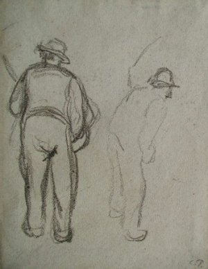 From an early date, Pissarro drew ordinary people going about their daily lives. In his time in Venezuela with Fritz Melbye the two of them would sketch interminably, recording the activities of the peasantry and townspeople they encountered. Pissarro filled sketchbooks with pencil and charcoal drawings of guitar players, cattle herders, and goose girls and so on. His early drawings presage his mature work: direct, unsentimental and descriptive. His later work is stripped of the detail and fussiness often apparent in his early drawings. A strong architectural line becomes dominant. Strength and simplicity are the hallmarks.