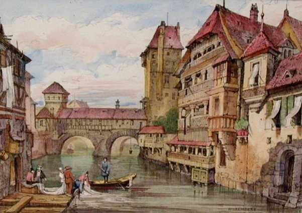 Samuel Prout was an English water-color painter. He was born at Plymouth, and spent whole summer days, in company with Benjamin Haydon, drawing the quiet cottages, rustic bridges and romantic watermills of the beautiful valleys of Devon. He made a journey through Cornwall to try his hand in furnishing sketches for Britton’s Beauties of England. In 1803 he moved to London, where he stayed until 1812. In London, Prout saw new possibilities, and endeavoured to correct and improve his style by studying the works of the rising school of landscape. To earn a living, he painted marine pieces for Palser the printseller, took students, and published drawing books for learners. He was one of the first to use lithography in his artwork.