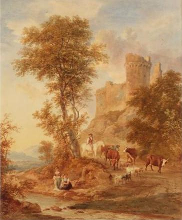 Ramsay Richard Reinagle was an English portrait, landscape, and animal painter, and son of Philip Reinagle. He was a pupil of his father, whose style he followed, and he exhibited at the Royal Academy as early as 1788. He afterwards went to Italy, and was studying in Rome in 1796. Subsequently he visited Holland in order to study from the Dutch masters. After his return home he painted for a time at Robert Barker’s panorama in Leicester Square, and then entered into partnership with Thomas Edward Barker, Robert’s eldest son, who was not himself an artist, in order to erect a rival building in the Strand. They produced panoramas of Rome, the Bay of Naples, Florence, Gibraltar, Algeciras Bay, and Paris, but in 1816 disposed of their exhibition to Henry Aston Barker and John Burford