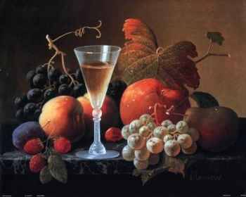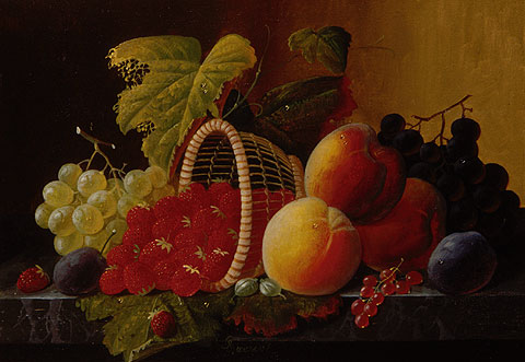 Numerous items in Fruit and Wine Glass, for example, also appear in other paintings. The footed desert plate full of strawberries is a common motif. The pilsner glass, sometimes accompanied by an open bottle of champagne, is interchangeable with a wine goblet filled with lemonade used elsewhere. The glass is nearly always placed at the lower left edge of the painting; a halved lemon often appears nearby. Branches full of grapes arranged from lower left to upper right provide the composition with a graceful S-curve and subtly lead the viewer’s eye over the entire display. Here the composition is balanced by light and dark grapes at either side and filled in by scattered raspberries, cherries, peaches, apples, pears, and apricots. Many of these compositional elements, if not the items depicted, were derived from seventeenth-century Dutch still life paintings by such artists as Jan van Huysem.