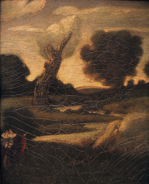 Ryder’s early work is described as Tonalist in style and commonly depicting pastoral landscapes. As he progressed in his career, Ryder’s work became more descriptive, sometimes referencing opera and literature. Ryder’s work has a dreamlike quality filled with abstracted forms applied with layers of paint that took years to dry. Many of Ryder’s paintings appear with large cracks today because he often painted into wet varnish.