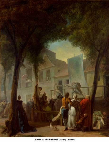 Gabriel-Jacques Saint-Aubin (1724-80) was the most famous of the four artistic Saint-Aubins. He was a major representative of French Rococo, the prevalent style after Louis XIV’s death in 1715. This style was championed by the French nobility who left Versailles for Parisian townhouses or hotels in Paris after the Sun King (Louis XIV) died. Saint-Aubin is best known for his depictions of everyday life in Paris. In the picture above, the commedia dell’arte, featuring the characters Crispin and Harlequin is being performed on a wooden stage, pedestrians stop to enjoy it. Saint-Aubin is especially appreciated by art historians for his paintings of Paris Salons and other art shows.
