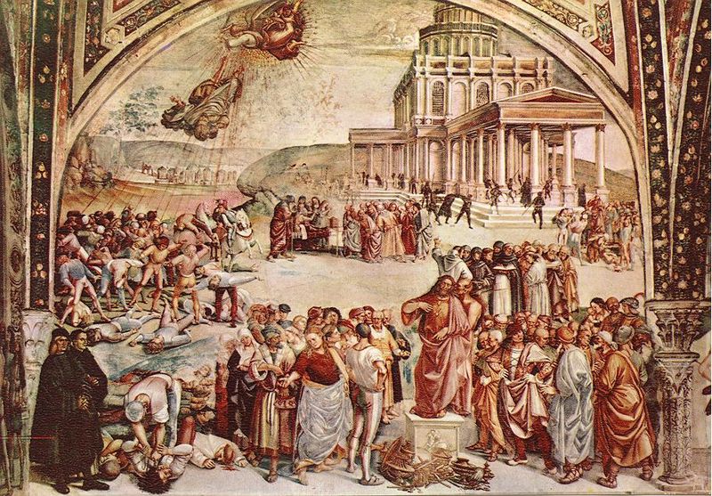 From Siena, Signorelli went to Orvieto, and produced his masterpiece. These are the frescoes in the chapel of S. Brizio, in the cathedral, which already contained images in the vaulting over the altar by Fra Angelico, who had begun the murals fifty years earlier. The works of Signorelli represent the events surrounding the Apocalypse and the Last Judgment. The events of the Apocalypse, which reflect the scripture readings for the four Sundays during Advent, fill the space which surrounds the entrance into the large chapel. The events begin with the Preaching of Antichrist, and proceed to the Doomsday and The Resurrection of the Flesh. They occupy three vast lunettes, each of them a single continuous narrative composition. In one of them, Antichrist, after his portents and impious glories, falls headlong from the sky, crashing down into an innumerable crowd of men and women. The events of the Last Judgment, which reflect the scripture, read at the Feast of All Saints. These paintings fill the vaults and the space around the altar. Paradise, the Elect and the Condemned, Hell, the Resurrection of the Dead, and the Destruction of the Reprobate fill the lunettes surrounding the altar. To Angelico’s ceiling, which contained the Judging Christ and the Prophets led by John the Baptist, Signorelli added the Madonna leading the Apostles, Patriarchs, Doctors of the Church, Martyrs, and Virgins. There is also a great deal of subsidiary work connected with Dante, and with the poets and legends of antiquity. Other murals in the chapel depict an explicit reference to two important Orvietan martyrs in the centuries preceding the execution of the lunette paintings.