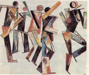 Varvara Stepanova was a Russian artist assocated with the ‘Constructivist’ movement. She came from peasant origins but was fortunate enough to get an education at Kazan School of Art, Odessa. There she met her life-long friend and collaborator Alexander Rodchenko. In the years before the Russian Revolution of 1917 they shared an apartment in Moscow with Wassily Kandinsky and through him met Aleksandra Ekster and Liubov Popova. These artists became some of the main figures in the Russian avant-garde. The new abstract art in Russia which began around 1909, was a culmination of influences from Cubism, Italian Futurismand traditional peasant art. She designed Cubo-Futurist work for several artists’ books.