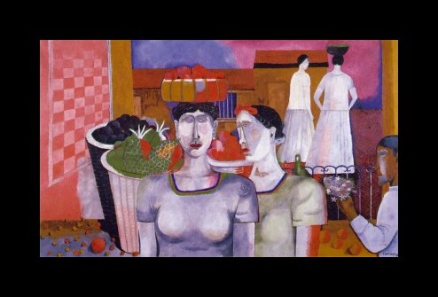 Even though Tamayo’s prints are highly recognizable and carefully labeled and numbered, his oil paintings are not as easy to distinguish. His prints have a very recognizable style and color palate, but his oil paintings vary, though not drastically. Tamayo strays from his warm color scheme of reds, yellows and earth tones in his painting “Women of Tehuantepec” (1939). In this scene, painted from the memory of his aunts fruit stand, he uses white, blues and greens. The background is still reflective of his warm color scheme, but these colors tend to pop out more.