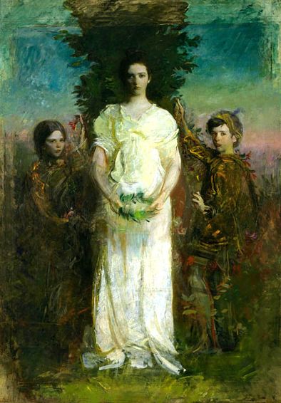 When Thayer was eighteen he moved to Brooklyn where he studied painting at the Brooklyn Art School and the National Academy of Design. Thayer moved to Paris with his wife and continued his studies at the Ecole de Beaux-Arts. When Thayer returned to America from Europe he opened a studio in New York where he hired apprentices to help him with his steady flow of commissions. Thayer painted portraits of important writers such as Mark Twain and Henry James. In addition to painting celebrities, Thayer frequently painted his children. After two of Thayer’s children tragically died, he suffered greatly, decided to leave New York and concentrated on painting his three surviving children frequently