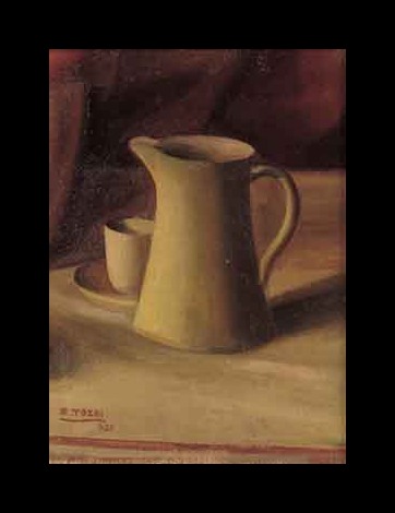 These early compositions also featured typical academic pieces, such as this still life painting of a pitcher: