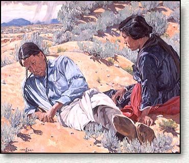 Ufer’s paintings depicted Native American life in a realistic, unidealized manner. Ufer tried to show the oppression and social injustices that the Native people faced. Ufer was a politically active member of the Socialist party and personal friend of Socialist leader, Leon Trotsky. Ufer joined worker strikes and fought for social justice.