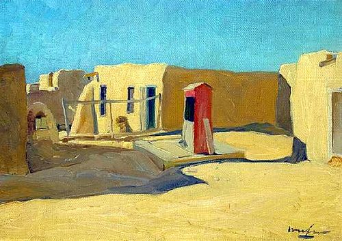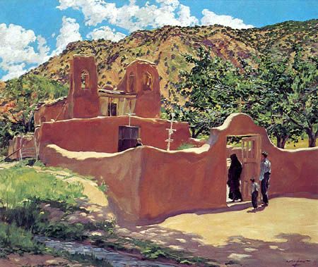 Walter Ufer was an American painter of the Taos Society of Artists in New Mexico. Ufer was born in Hückeswagen, Germany, but lived there only one year before his family relocated to Louisville, Kentucky. Ufer showed artistic talent at an early age and went to work as a lithography apprentice. Ufer was encouraged to receive formal art training, and spent five years studying at Germany’s Royal Academy of the Fine Arts. In Germany, Ufer met a group of influential American painters, including Joseph Henry Sharp and Ernest Blumenschein.